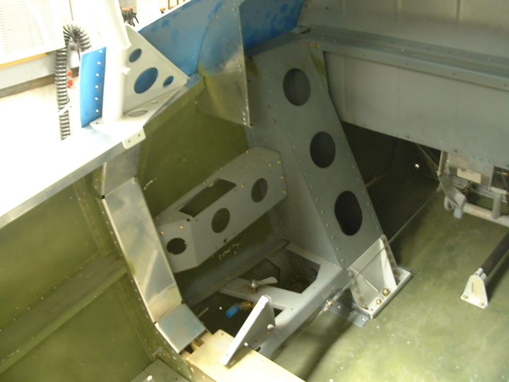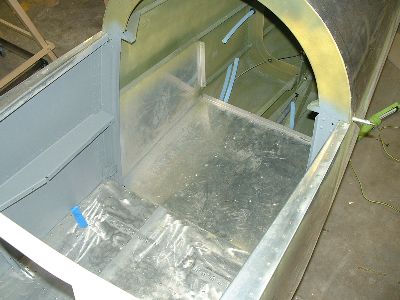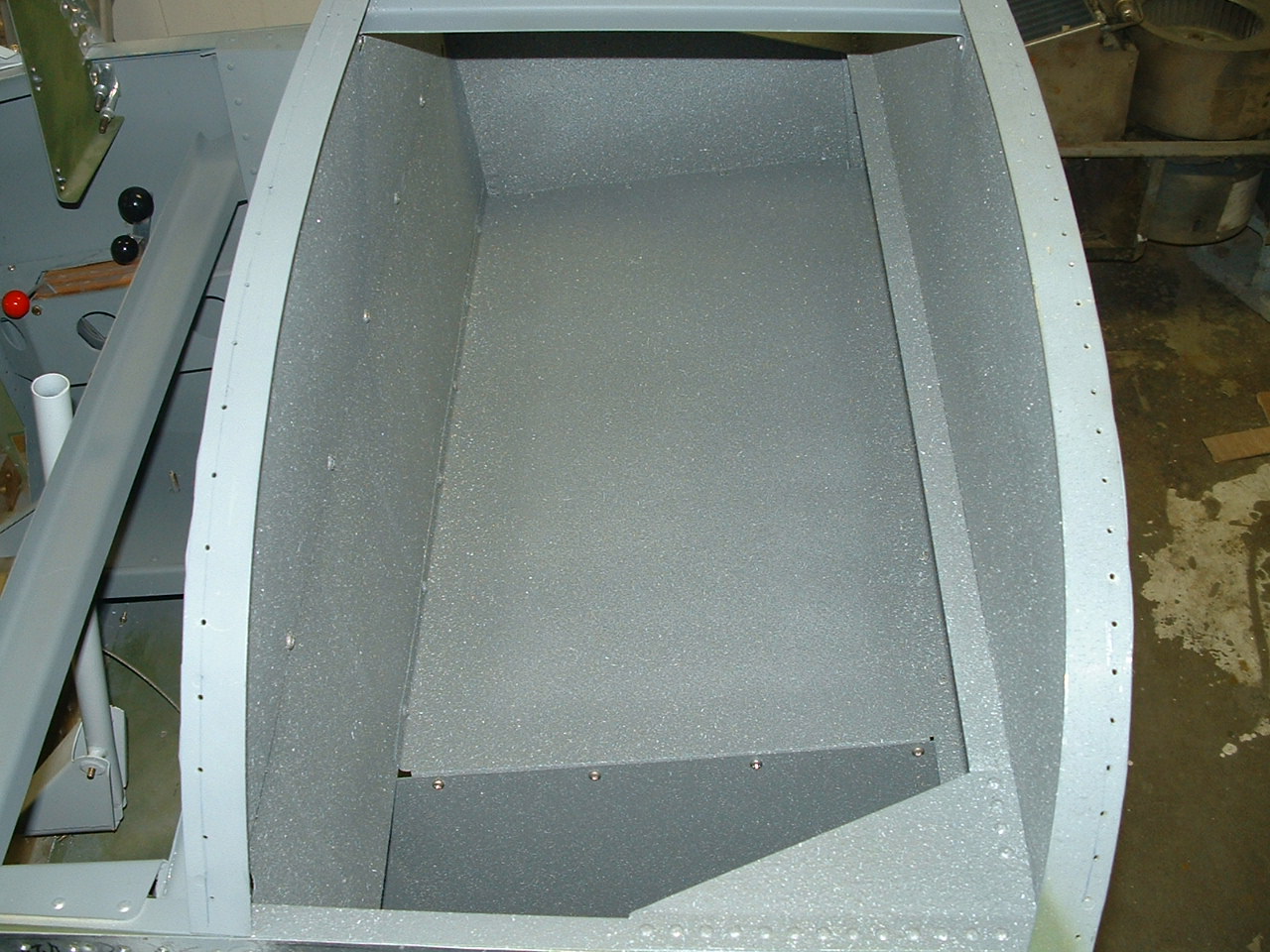 Front baggage compartment finished. I used gray splatter paint as a finish so that there would be a little texture to it. It turned out so well that I've been told I should paint the entire inside with it. If I didn't plan to do the interior nice with cloth, I would really consider that option! |
